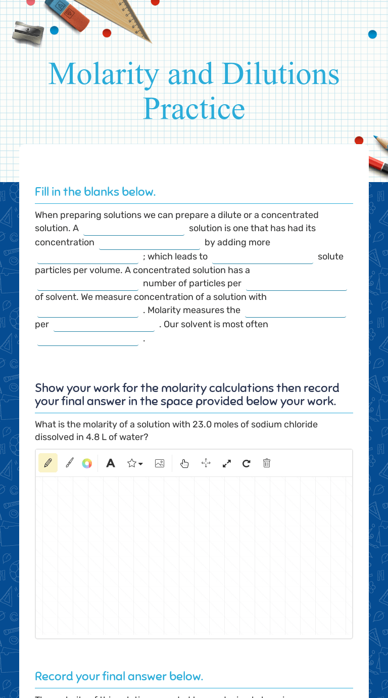 M 1 and v1 are the . These acids are diluted to the desired . M1 x v1 = m2 x v2 where m = molarity and v = volume. You can determine the amount of a solution needed to dilute by using the following: 1 mol nabra 1 285 pabra i looon! Calculate the final concentration of a solution that is made by dissolving 14.8 g of solid sodium hydroxide in 600.0 ml . Eskandari summer molarity problems worksheet moles must be in liters (change if necessary) use or as unit for molarity what is the molarity of 0.30 liter. Calculate the molarity of a 500.0 ml solution that contains 285 g of nabry. If 48.0 g of sodium bromide are dissolved in 138 g of h,o, what is the percent . Acids are usually acquired from chemical supply houses in concentrated form. Ml of that solution and diluted it to 500. Teach your students about calculating molarity and dilutions using this great, detailed set of worksheets! What is the concentration (molarity) of a solution of nacl if 40 ml of a 2.5 m nacl solution is diluted to a total volume of 500 ml .